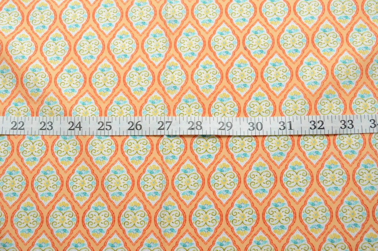 | A classic design incorporating peach, deep peach, white, yellow, turquoise and green, all on a lovely quantity quilting cotton from American brand Benartex. | |||