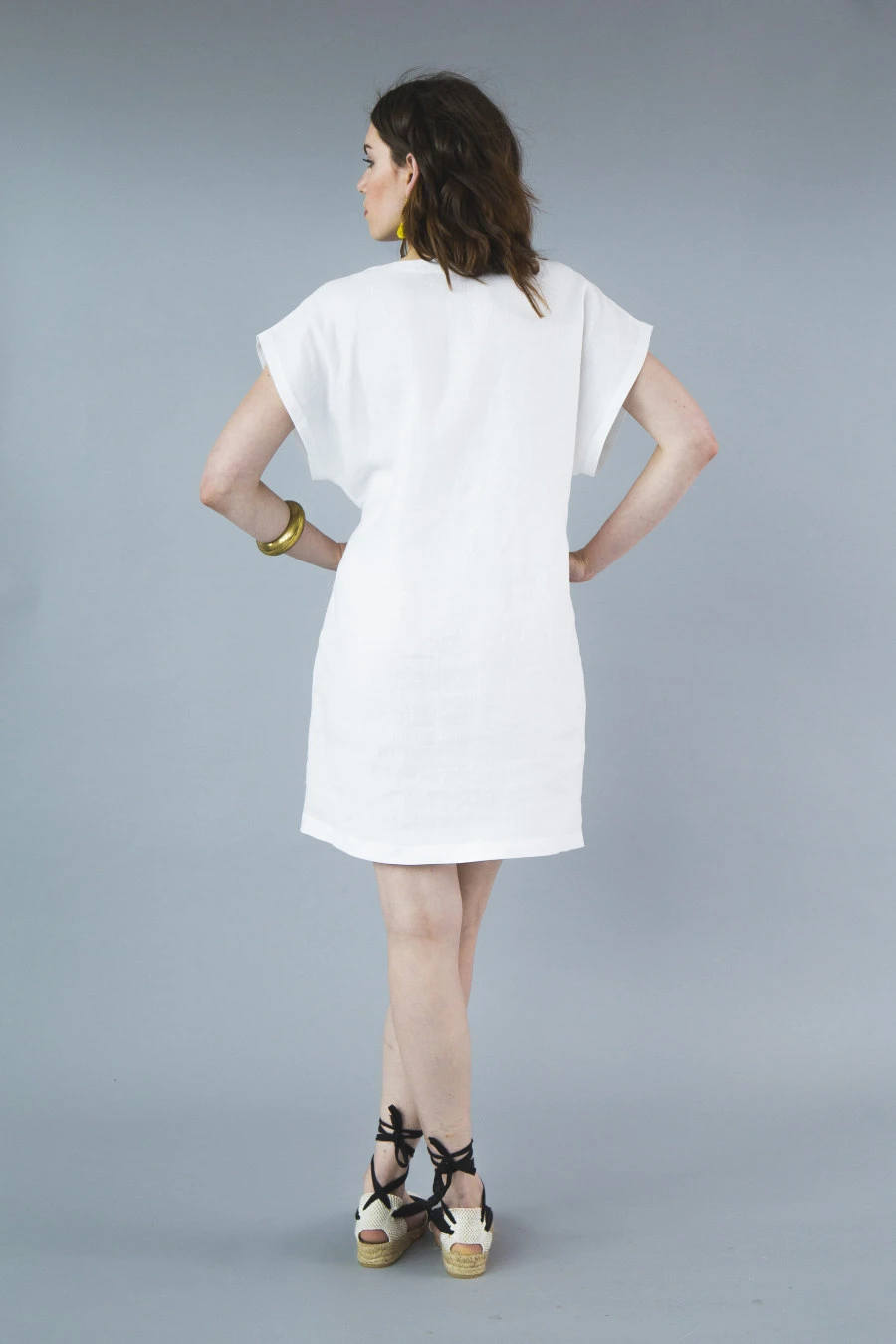 Charlie is a must-have pattern for summer elegance, offering a fresh take on the classic caftan. Each version of the pattern includes a deep V neckline, short dolman sleeves, an inset center panel, and spacious pockets.