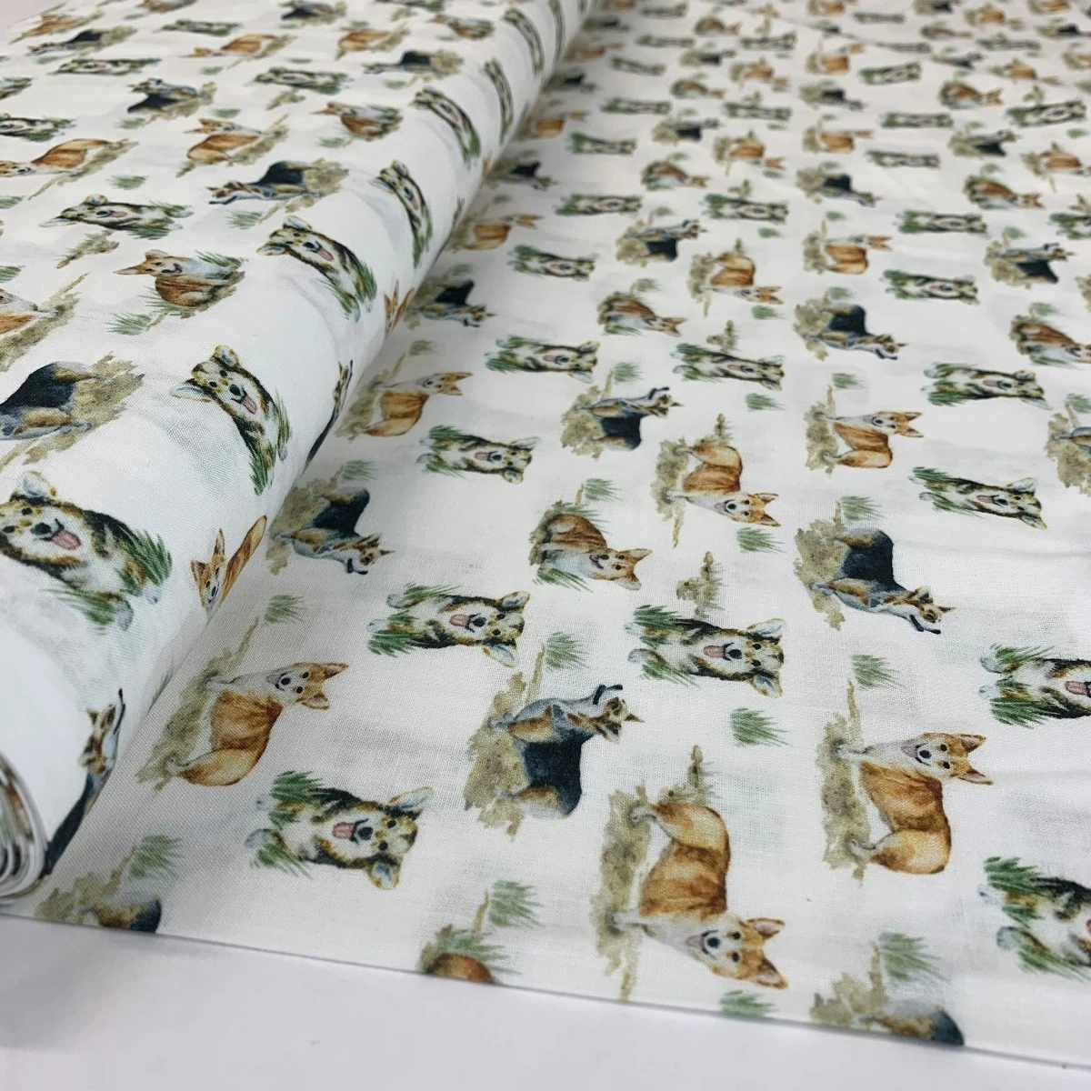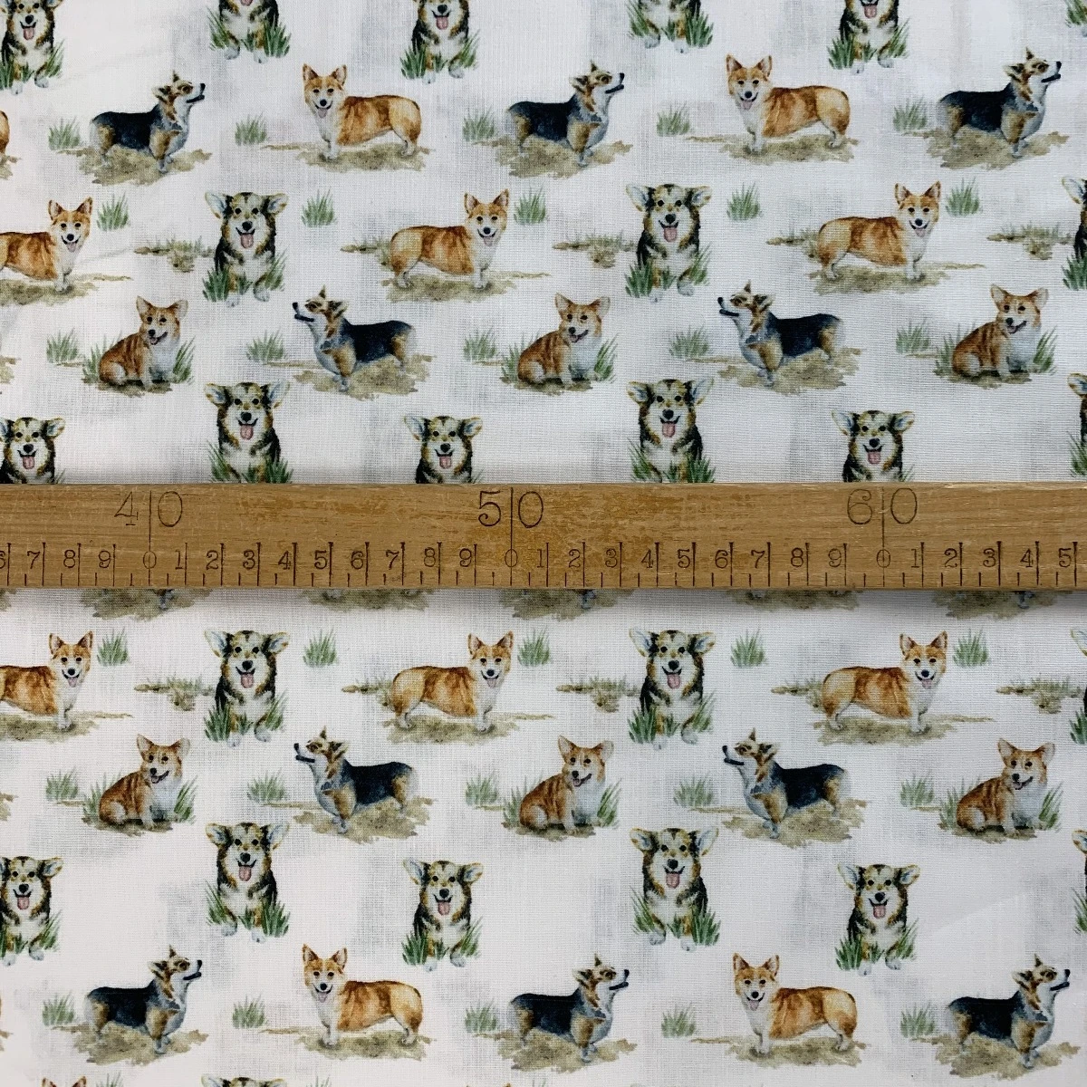 Introducing our beautifully soft and high-quality 100% cotton fabric showcasing a beautifully detailed painted corgi dog print on a soft white ground, capturing the charm and playfulness of these beloved furry companions.