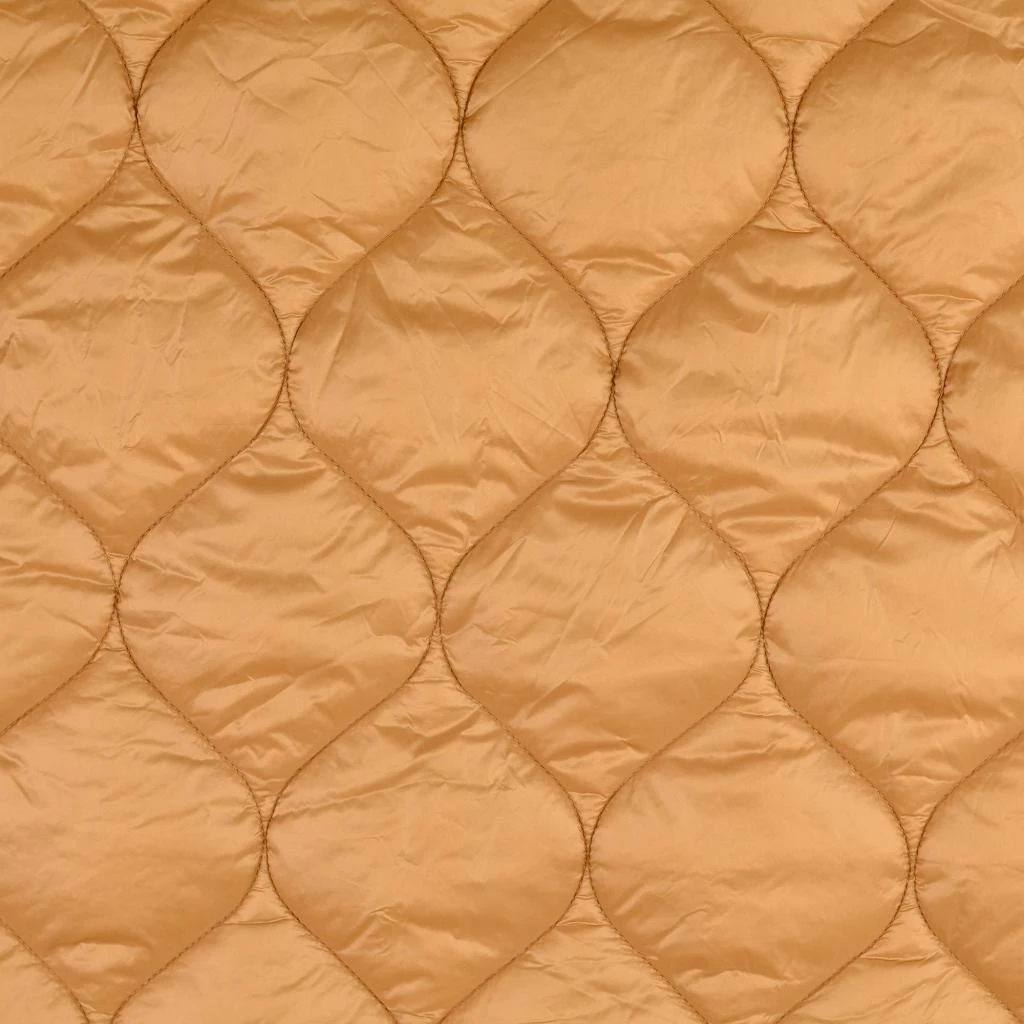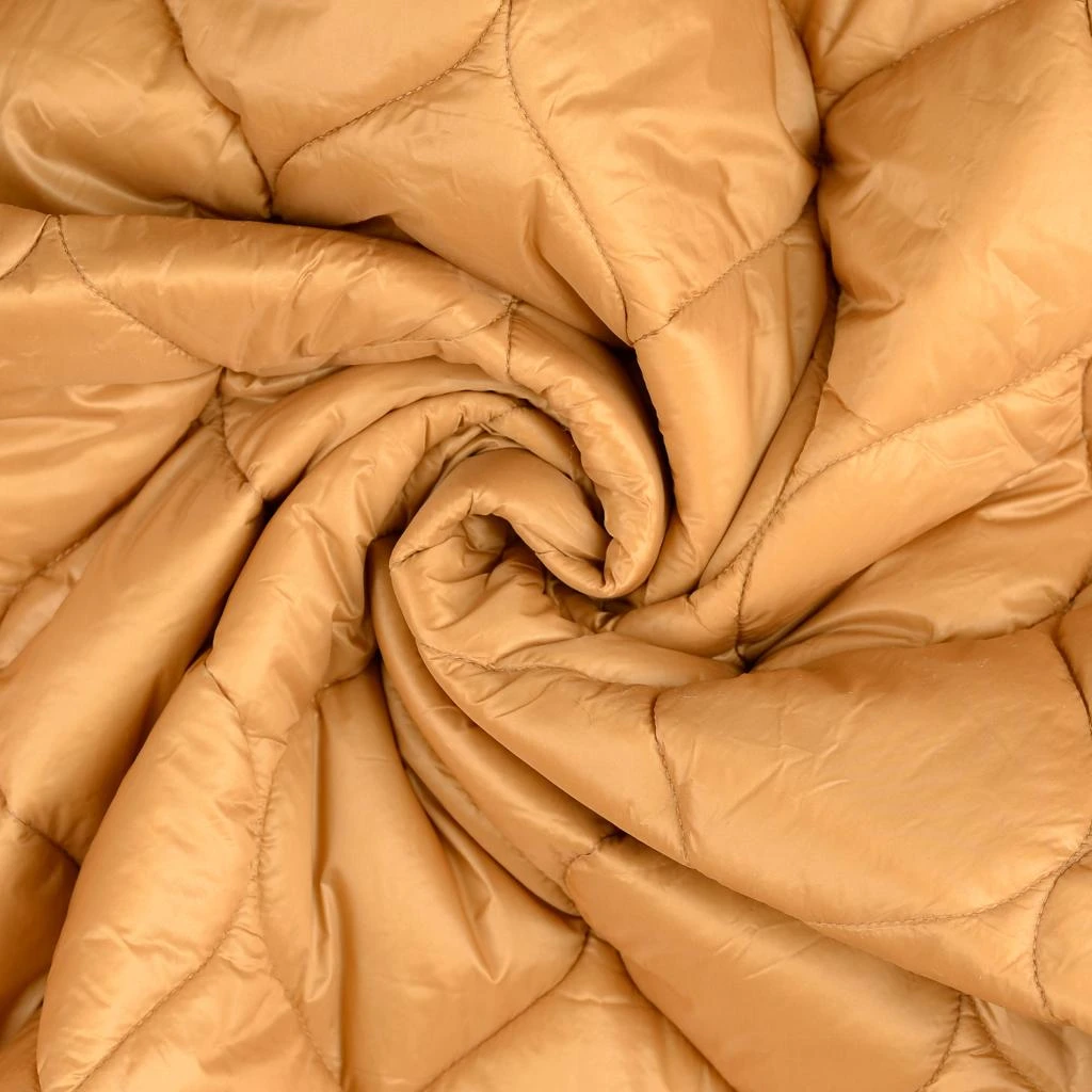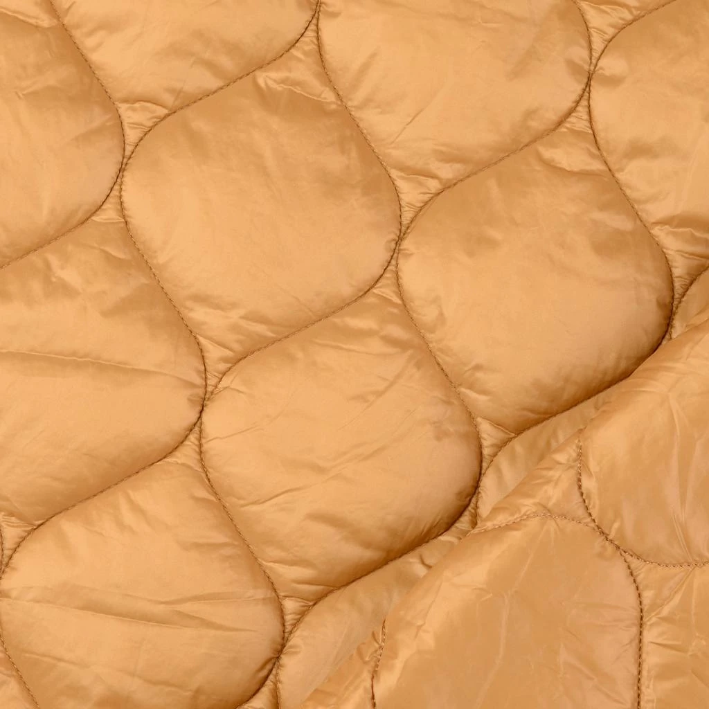 Stay warm and stylish this season with this tan quilted wind-resistant coating fabric, featuring an onion weave design and 2oz wadding, it is the perfect choice for crafting padded jackets, gilets, and unique bags.