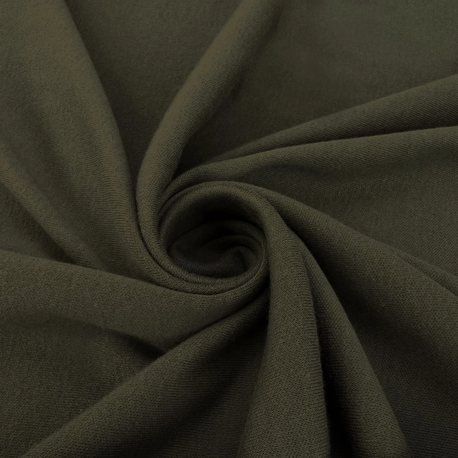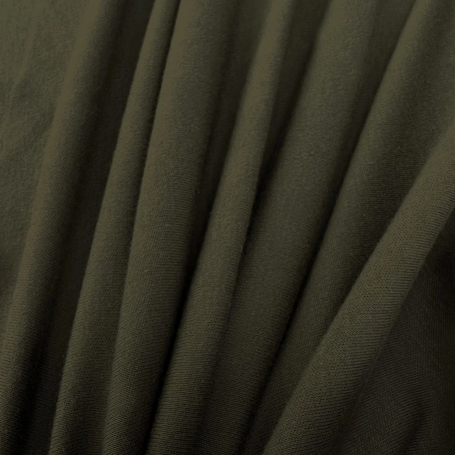 Fabulous 160cm wide cotton interlock jersey fabric in khaki green, proudly knitted in the UK. This mid weight fabric is the ideal choice for t-shirts, tops, underwear, and nightwear, offering endless versatility.