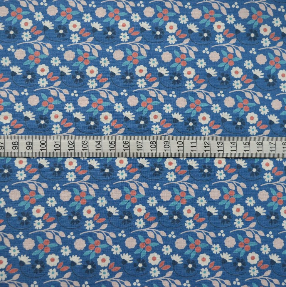 | 112cm wide superb quality solid craft/quilt cotton fabric in rich royal blue with an all over floral pattern in white and different shades of pink. Refreshing! | |