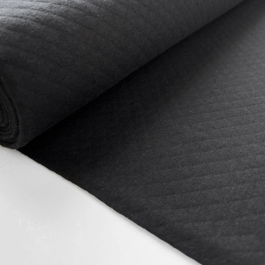Indulge in the luxurious warmth of our ex-designer black quilted fabric, a perfect blend of 80% cotton and 20% polyester. At 160cm wide, this fabric is not just a material; it’s a cosy embrace waiting to be transformed into your next creation. The unique diamond quilted design adds a touch of elegance, making it ideal for crafting house coats, dressing gowns, stylish jackets, and gilets.