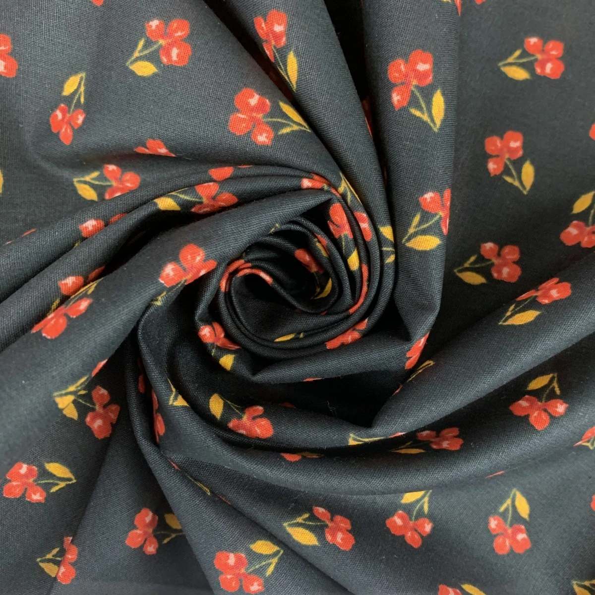 Oeko-Tex Standard 100 organic cotton poplin fabric with a small floral themed print in red and ochre on a black background.