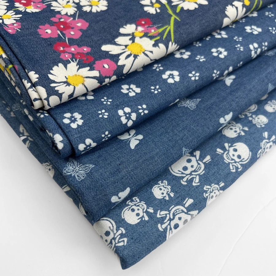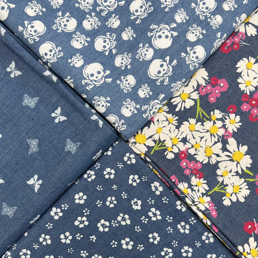 Mixed bundle pack, 4 x 1 metres of printed denim chambray fabric. Made up from deadstock fabrics, end of line cloths, and special one-off pieces – previously used for photography purposes.