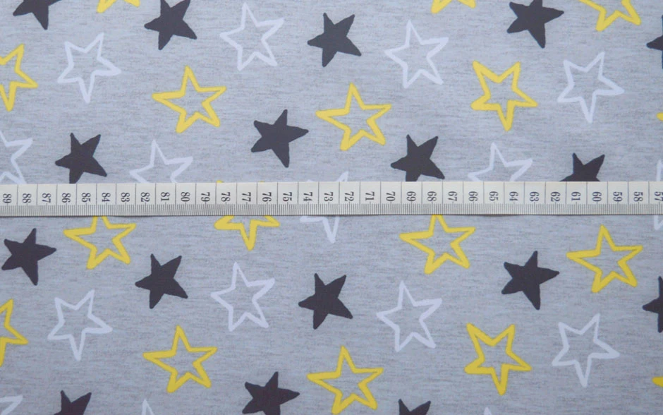 | Soft Shell jacketing fabric. Printed polyester with a micro-fleece backing. It comes in grey with a star print and a turquoise fleece backing. Now then, what do I think you’re going to make out of this? Well because of the microfleece backing it suggests lightweight jacket. Or possibly yodelling shorts, of course, I am joking. Made in a very expensive place for very expensive people. A very lovely material. | |