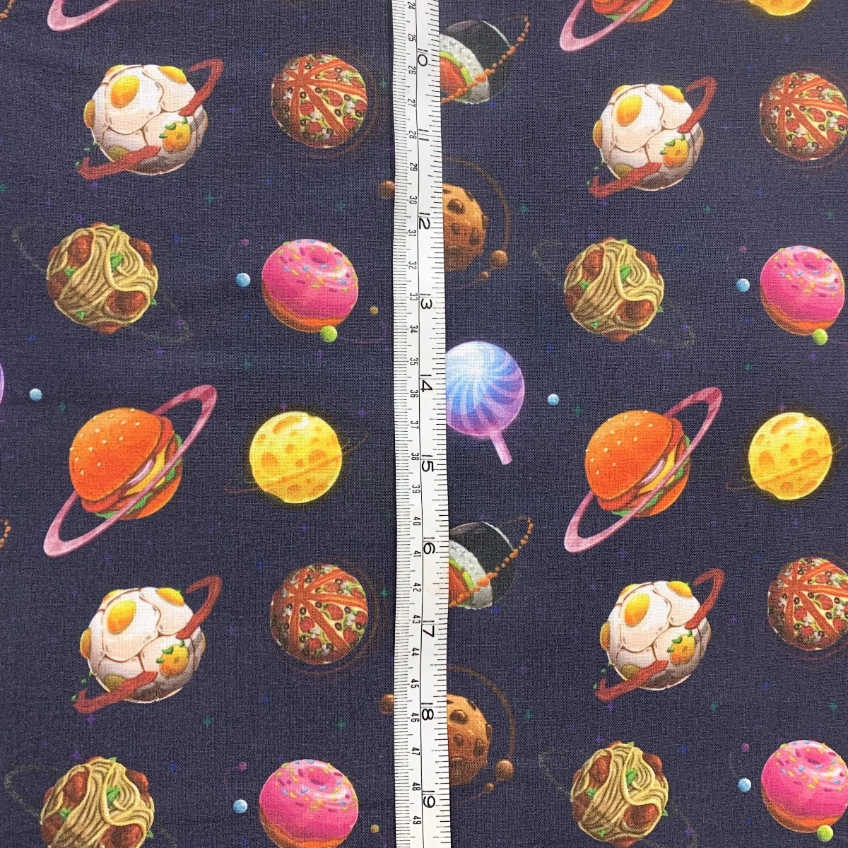 | Digitally printed in the UK this craft cotton fabric has a detailed print of planets as flying burgers, doughnut, pizza, cookies & sweets in space on a navy background. A quirky fabric perfect for unique crafts items and costumes. Perfect for crafts/bedroom blinds and costumes. | |