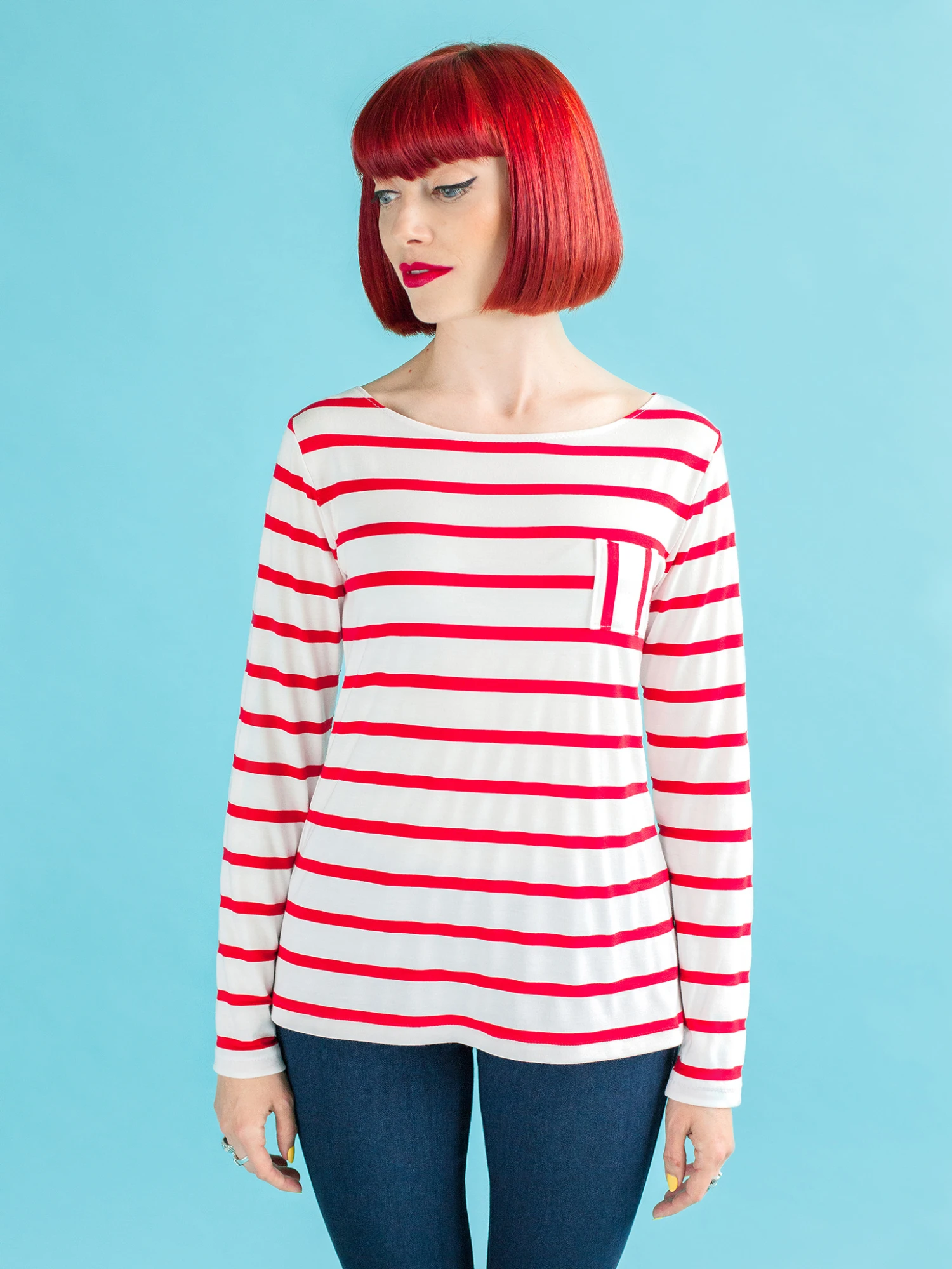 Elevate your closet with timeless Breton tops, snug knit dresses and stylish sixties-inspired funnel necks โ all stemming from one versatile pattern! Swiftly sewn, this iconic design is a seamless introduction to low-stretch knit fabrics. Opt for a sophisticated boat neckline or a cosy funnel roll neck. Embrace optional patch pockets for practicality and three sleeve variations – full, three-quarter length, with or without rolled cuffs. Tailor your style with ease, from chic tops to delightful dresses.