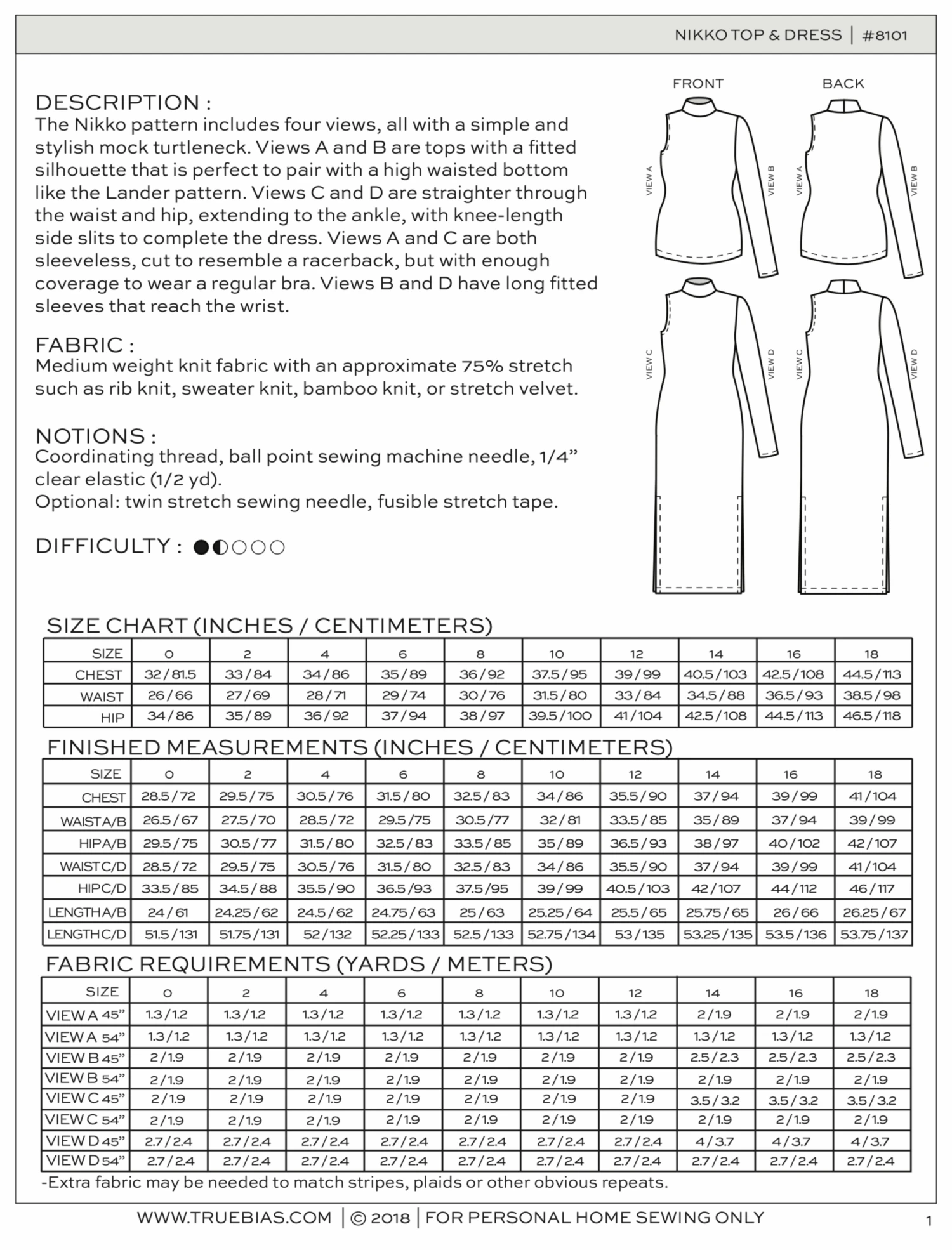 The Nikko pattern comprises four distinct views, each featuring a chic mock turtleneck design. Views A and B are tailored tops that complement high-waisted bottoms such as the Lander pattern, with a form-fitting silhouette. Views C and D, on the other hand, have a straighter cut from the waist to the ankle, with knee-length side slits for a stunning dress finish.