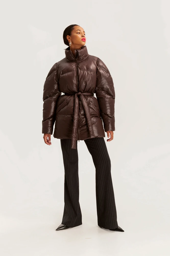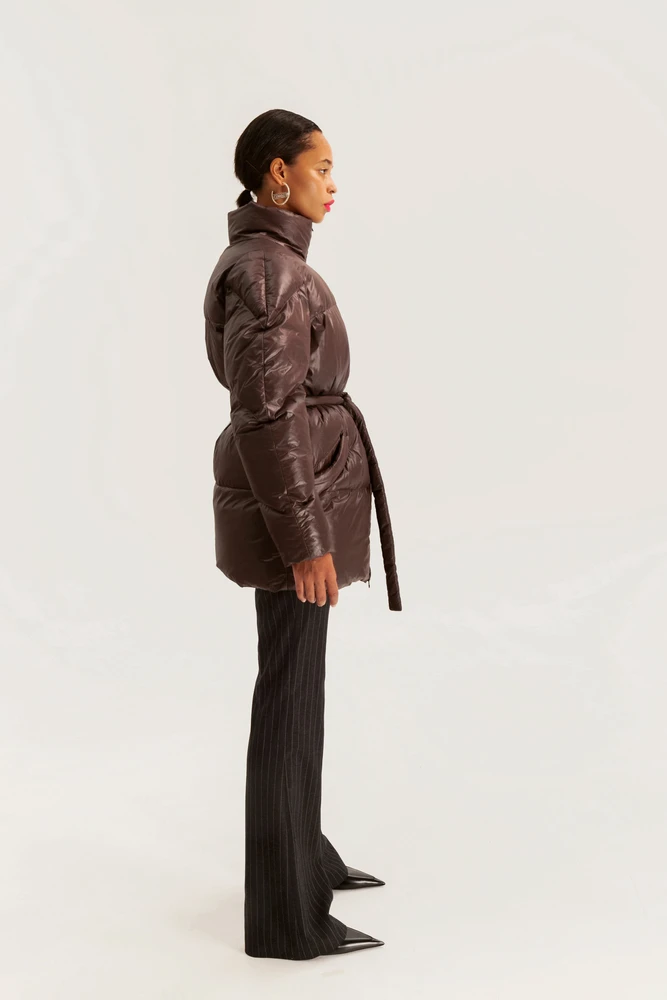 Gail also includes a stand collar and front welt pockets, with a center front closure through a separating zipper and zipper guard. Belt loops at the sides secure the tie belt, and Gail falls to a hip-length.