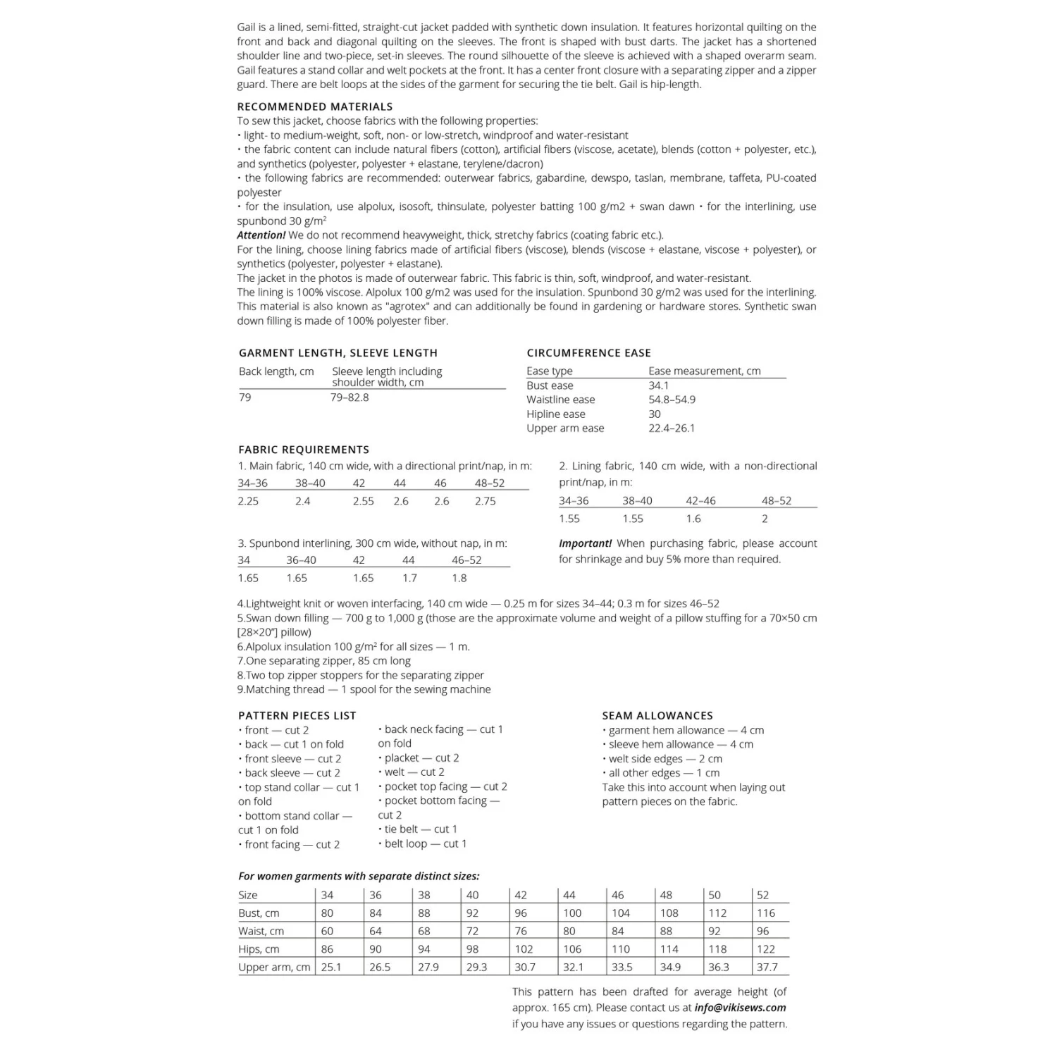 Gail is a semi-fitted, straight-cut jacket lined with synthetic down insulation. It showcases horizontal quilting on the front and back and diagonal quilting on the sleeves. The front boasts bust darts for shaping, and the jacket features a shortened shoulder line and two-piece, set-in sleeves. Achieving a rounded sleeve silhouette is accomplished with a shaped overarm seam.